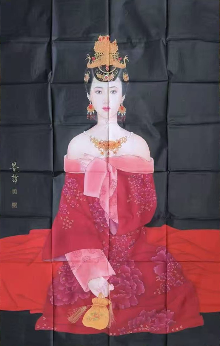此作以工笔绘红妆仕女,墨底衬艳裙,牡丹纹与金饰尽显华贵,人物眉眼清丽,线条细腻,色彩浓丽雅致
