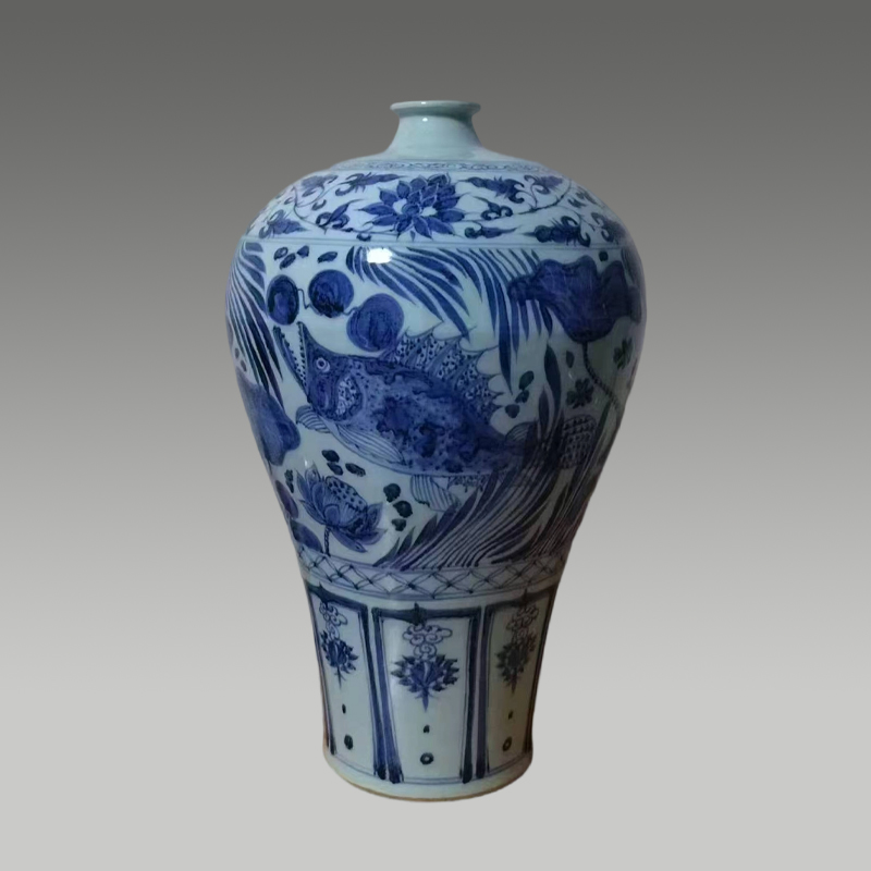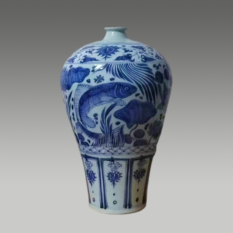 此青花鱼藻纹梅瓶,器型饱满端庄,青花浓艳明快。瓶身绘游鱼戏于水藻间,灵动鲜活,纹饰疏密有致