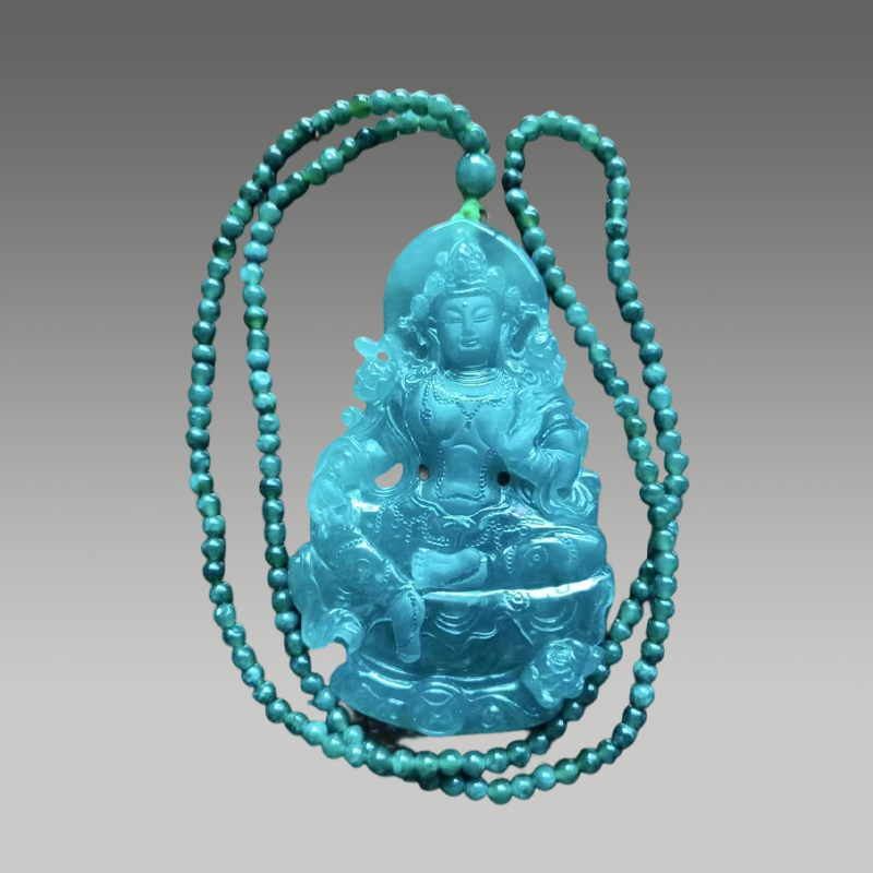 这件翡翠度母吊坠,冰润通透,蓝水底色清透雅致,飘雪灵动。雕工精湛,度母法相庄严慈悲,细节饱满