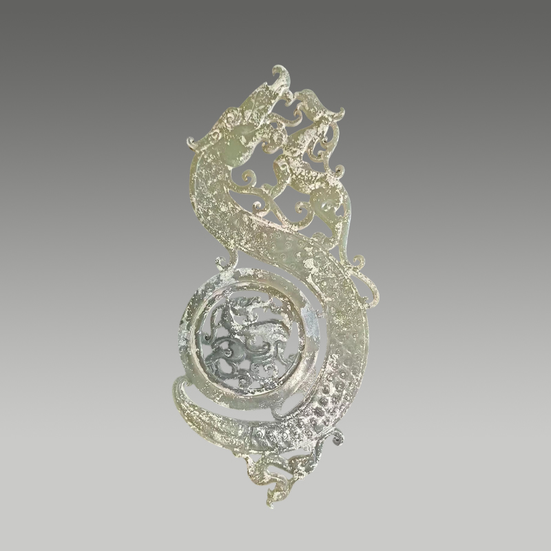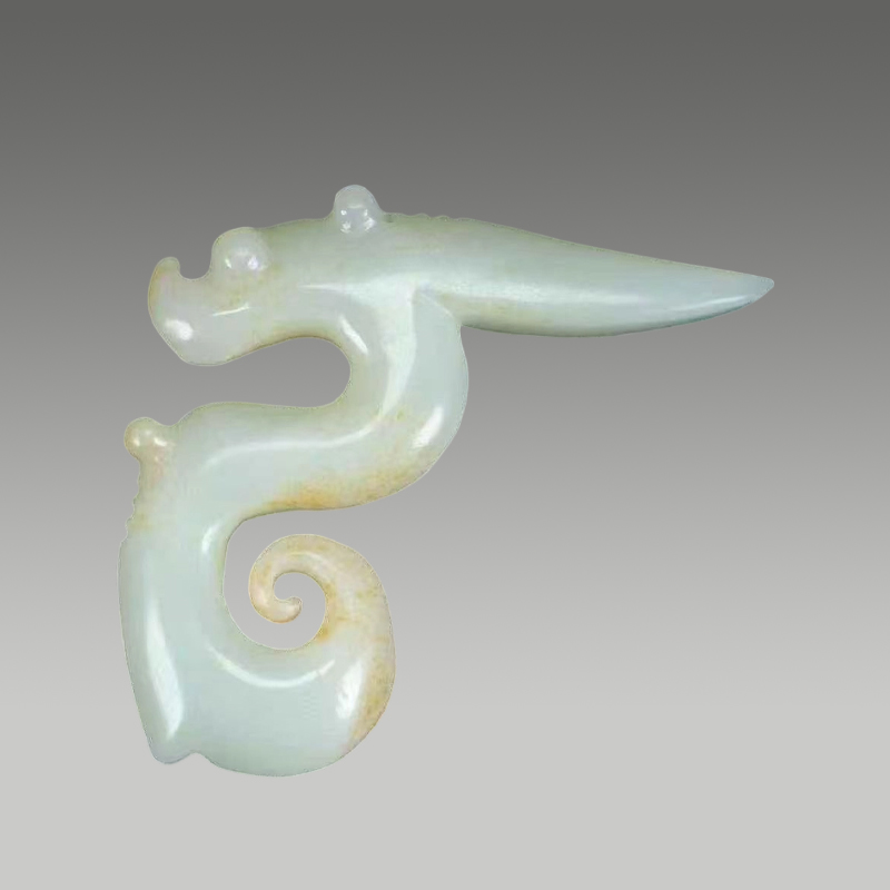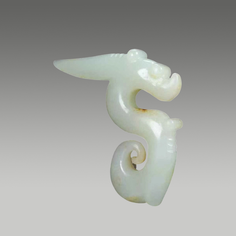 此玉质莹润细腻,色泽清和,龙形蜿蜒灵动,卷尾收势精巧,局部沁色自然晕染。线条流畅圆融,刚柔并济