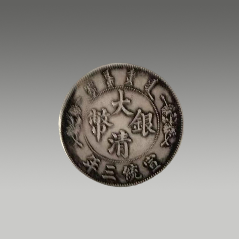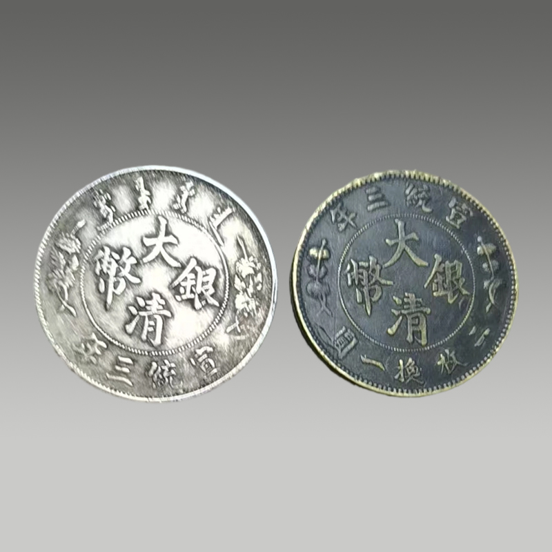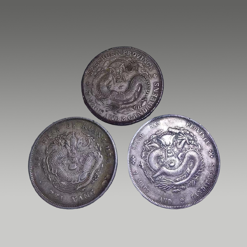 三枚银圆并置,龙纹遒劲,文字古朴,包浆温润,尽显岁月沉淀之美。形制规整,工艺精湛