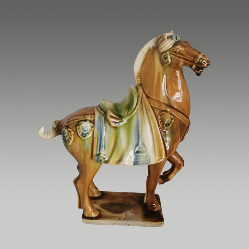 三彩骏马摆件,釉色流光溢彩,造型矫健昂扬,鞍饰精美,神骏灵动,气韵雄浑,尽显盛世风华