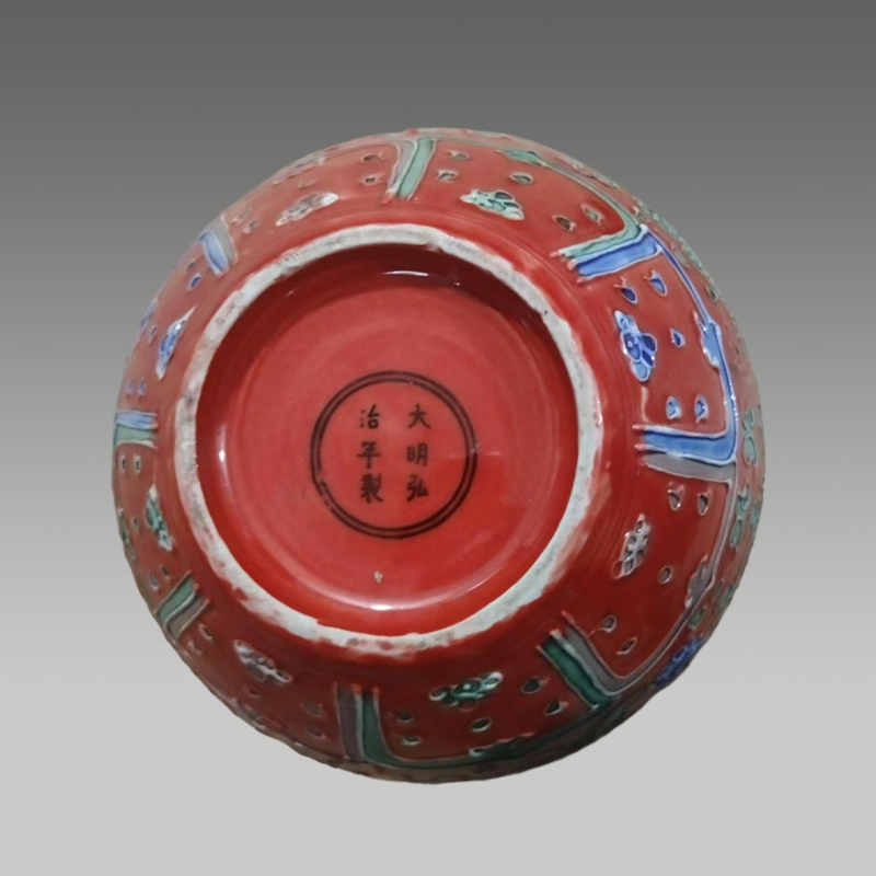 这尊天球瓶朱红为底,堆塑龙纹矫健灵动,五彩釉色鲜丽饱满,缠枝花卉与蕉叶纹层次分明