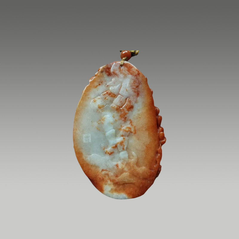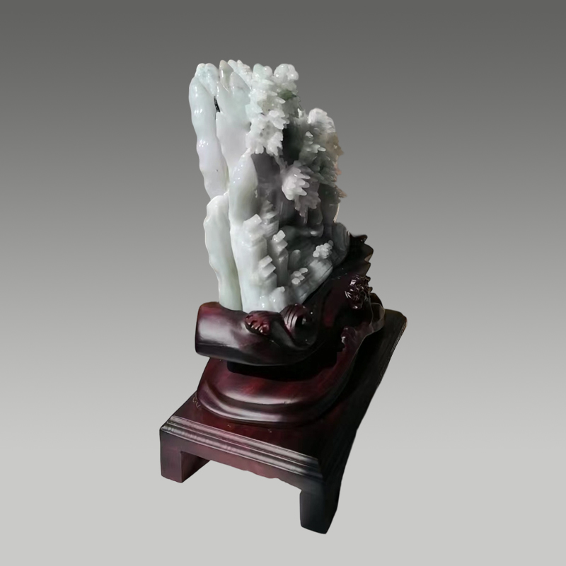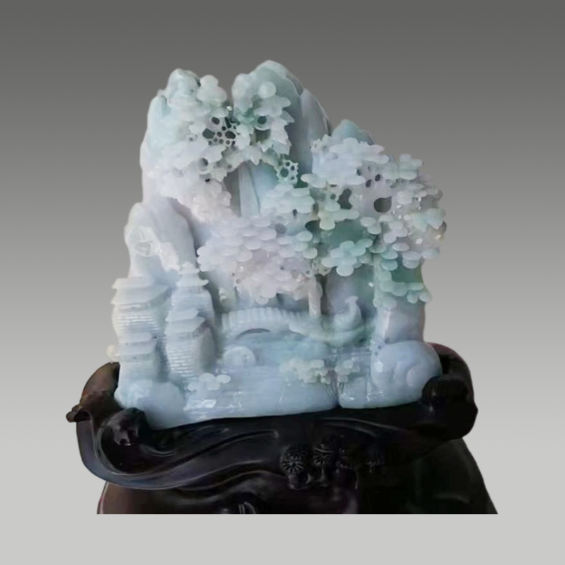 冰润莹洁的玉料凝萃山水灵韵,巧雕苍松亭台、飞瀑流泉,层叠有致。方寸间藏尽清幽雅意,气韵天成