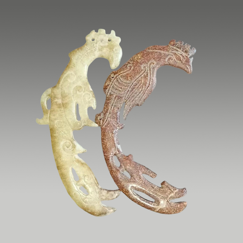 双凤对影成双,玉质凝润含光,一素一赭各具风华。冠羽卓然,身姿婉转灵动,刀工凝练传神