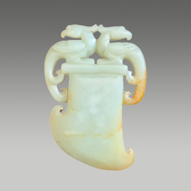此玉质温润凝腻,色泽清和,双凤衔福镂雕于斧形之上,线条婉转灵动,皮沁自然晕染