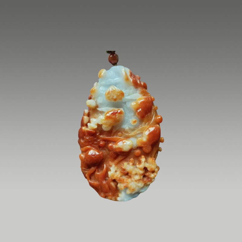 这件翡翠鱼趣吊坠,俏色巧雕浑然天成,红翡暖润如霞,白冰清透似雪。游鱼灵动鲜活,水草珊瑚栩栩如生