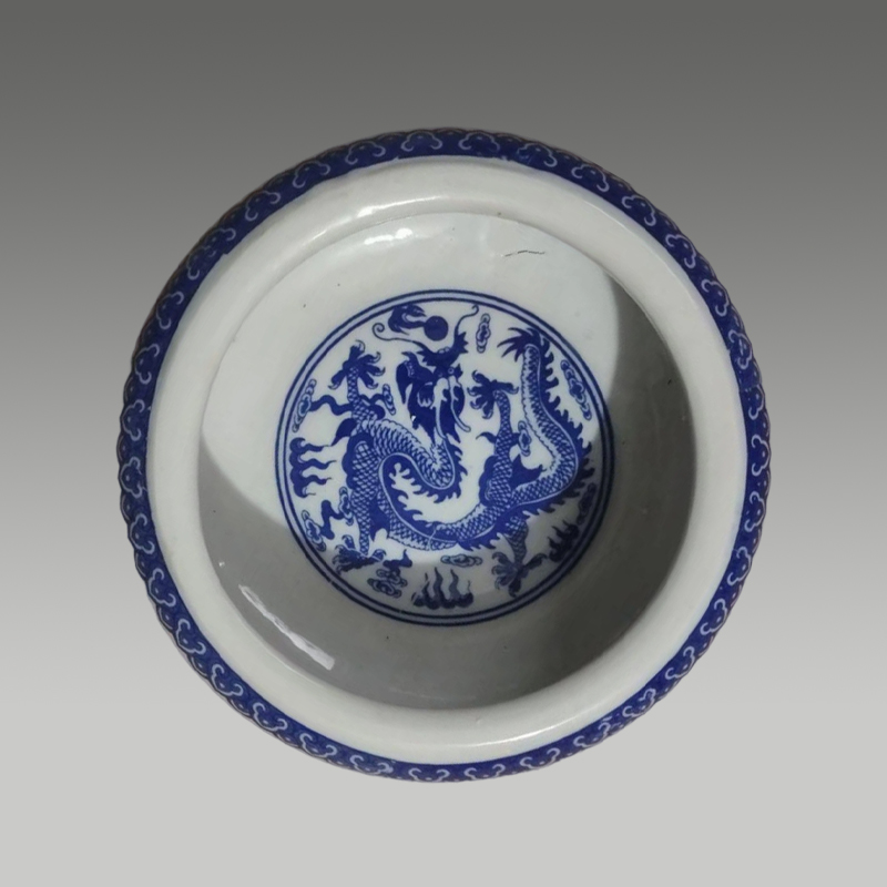 这青花笔洗,白釉莹润如脂,青花浓淡相宜。龙纹矫健灵动,云纹飘逸婉转,口沿纹饰精巧,尽显东方雅韵