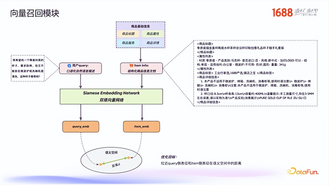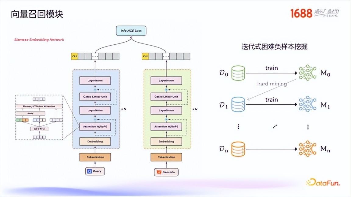场景化到参数化的映射:处理用户在特定场景下的不明确需求。例如,当用户搜索“能穿去哈尔滨的羽绒服”时,系统需要推理出其核心需求是超强的保暖性、防水性和防风性,并将其转换为供给侧的商品特征,如“充绒量 300 克以上、防水面料、防风立领设计”。碎片化到结构化的映射:处理语义不完整的 Query。例如,对于“TE HD10/12.F5 螺钉”这样的搜索,系统需要依赖知识联网功能,补全“泰科电子/TE Connectivity”这样的品牌信息,并准确解析出“HD10/12.F5”是型号规格,而非产品分类。用户语言到商品语言的映射:处理非供给侧的口语化描述。例如,当用户搜索“质量好一点的卫衣”时,系统首先需要将“质量好”映射为具体的商品语言,如“320 克精梳棉、三针五线工艺、抗起球处理”;其次,对于“好一点”这样的量化描述,系统可以根据用户的画像(如注重性价比的学生或关注设计感的职场精英)进行动态调整,推荐不同档次的商品。2. 向量召回模块:基于双塔模型与迭代式挖掘