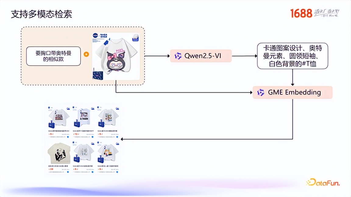 2.0 版本最大的亮点之一是支持了多模态检索。例如,用户可以上传一张带有库洛米图案的T恤图片,同时输入文本“要胸口带奥特曼的相似款”。系统需要精准理解这个复合需求:保留参考图的款式、版型、颜色等特征,但将核心图案元素替换为“奥特曼”。