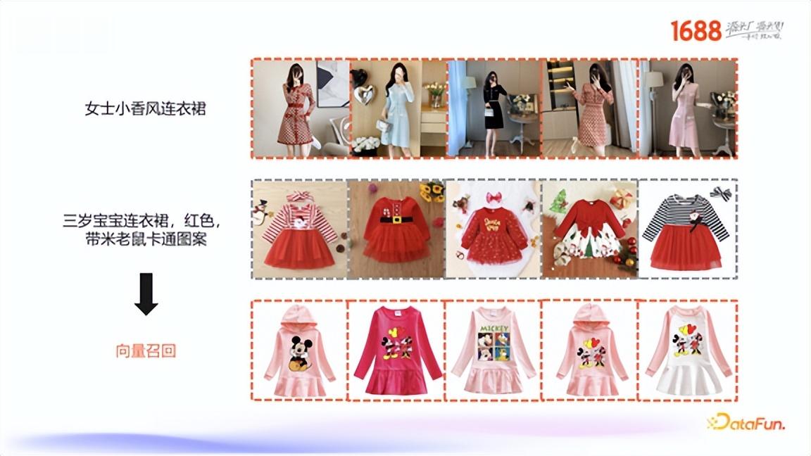 然而,它也存在明显的问题。在一些特别细粒度的 Query 上,模型可能会出现“幻觉”。例如,当用户搜索“三岁宝宝连衣裙,红色,带米老鼠卡通图案的”,生成式检索返回的结果虽然满足了“三岁宝宝”、“连衣裙”、“红色”等要素,但在最关键的“米老鼠卡通图案”这个细粒度属性上却出现了错误,生成了其他卡通图案。相比之下,传统的向量召回方案虽然在风格上可能略有偏差,但能准确地保留所有核心要素。
