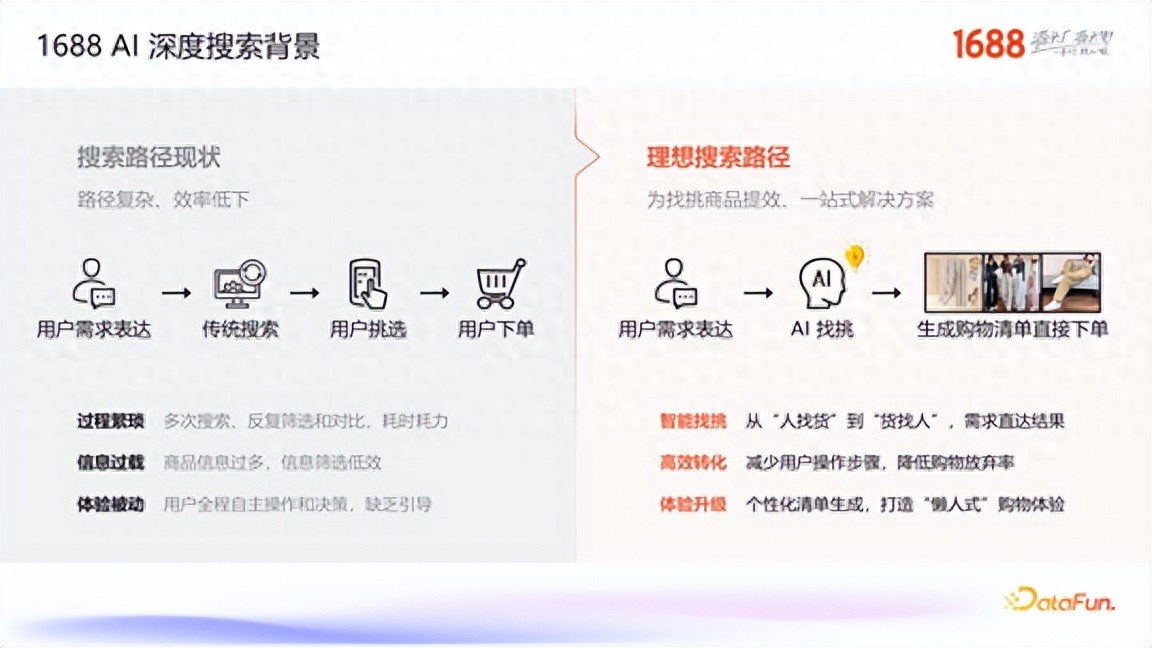 过程繁琐:用户为了找到完全匹配需求的商品,往往需要进行多次搜索,并结合筛选、排序等操作,整个过程耗时耗力。信息过载:商品的关键信息散布在标题、属性列表、详情页等各处,用户需要自行阅读和筛选,决策效率低下。体验被动:整个流程完全由用户自主操作和决策,平台缺乏有效的引导,体验较为机械。为了解决这些问题,我们构想了一种理想的搜索路径:用户表达需求后,由AI系统一步到位地完成“找”和“挑”的全过程,直接生成一个符合其需求的购物清单。这种模式的核心是实现从“人找货”到“货找人”的范式转变。AI 深度搜索的根本动机,正是为了提升用户寻找和挑选商品的效率,并提供一站式的解决方案。通过智能找挑,我们期望能有效减少用户的操作步骤,降低购物过程中的流失率;同时,通过生成个性化的购物清单,打造一种“懒人式”的购物体验,实现体验的全面升级。