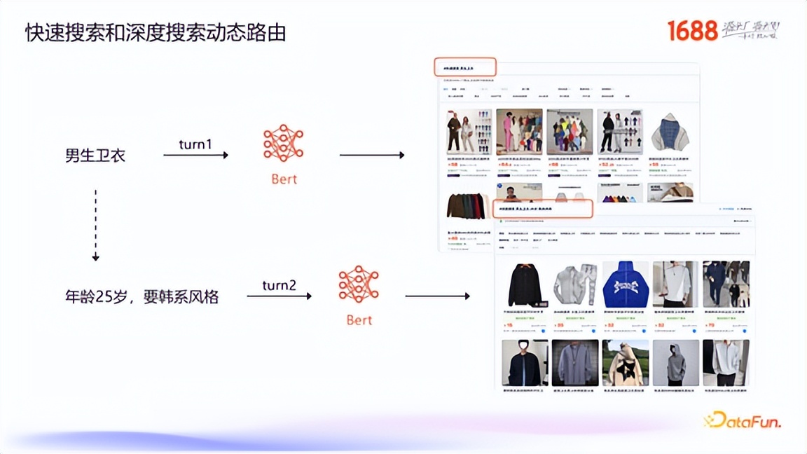 为了平衡不同用户的需求,我们保留了传统的快速搜索,并提供了深度搜索选项。两者之间的切换由一个我们训练的 Bert 意图路由模型自动完成。当用户输入一个简单的、明确的商品词(如“男生卫衣”)时,系统会路由到快速搜索;而当用户输入一个带有复杂描述的 Query(如“年龄 25 岁,要韩系风格”)时,系统则会自动切换到深度搜索模式,以更好地理解和满足其个性化需求。