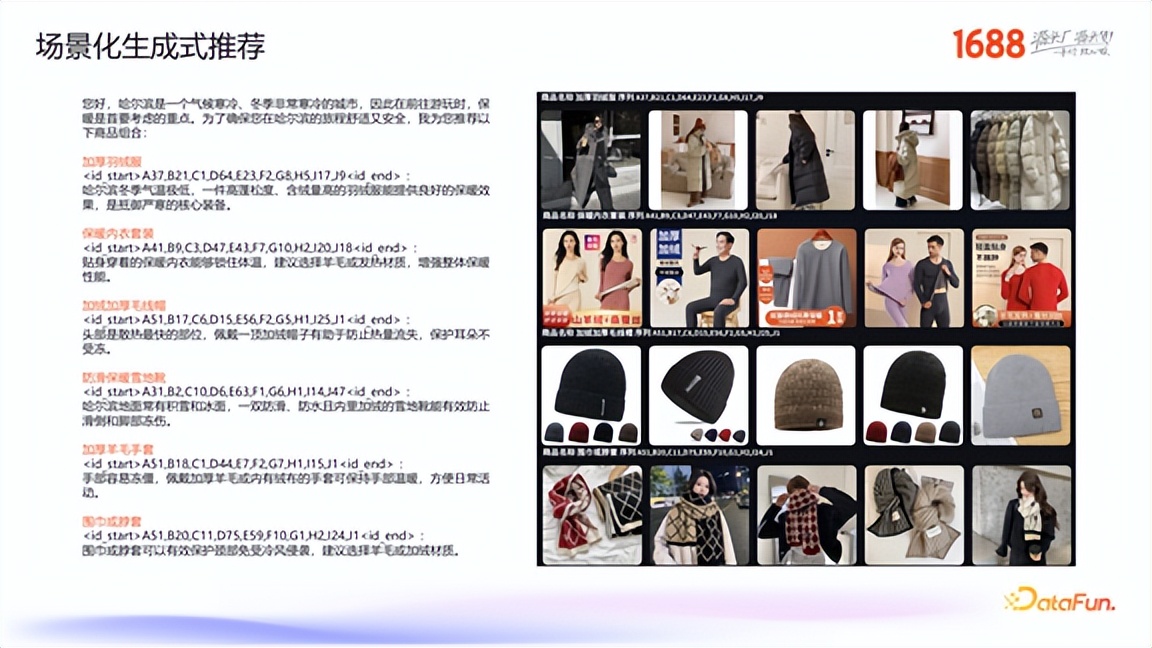 例如,对于一个场景化 Query“冬天去哈尔滨游玩,我应该穿什么?”,模型能够像导购一样,进行思考并生成一个完整的购物清单,包括加厚羽绒服、保暖内衣、毛线帽等,并为每个品类推理出对应的商品码本。从解码出的商品来看,效果非常出色,证明了该技术在场景化推荐中的巨大潜力。