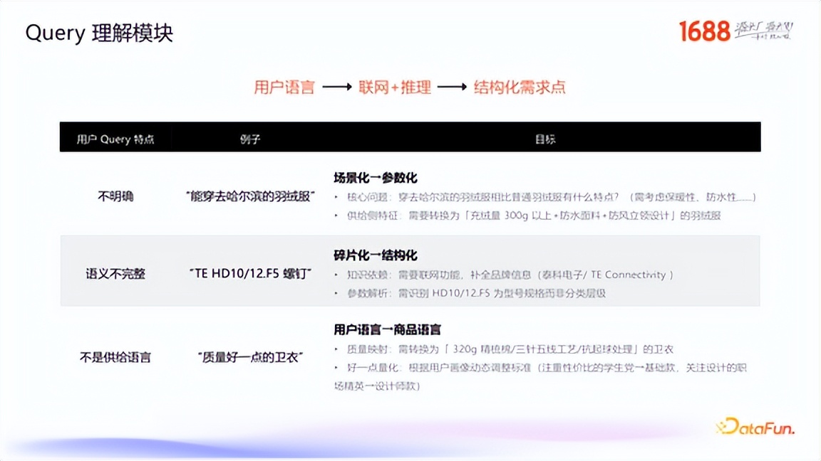 在 Query 理解模块,我们的核心目标是实现三种关键的映射转换,从而将用户的模糊、口语化的语言,转化为机器可理解的结构化需求点。