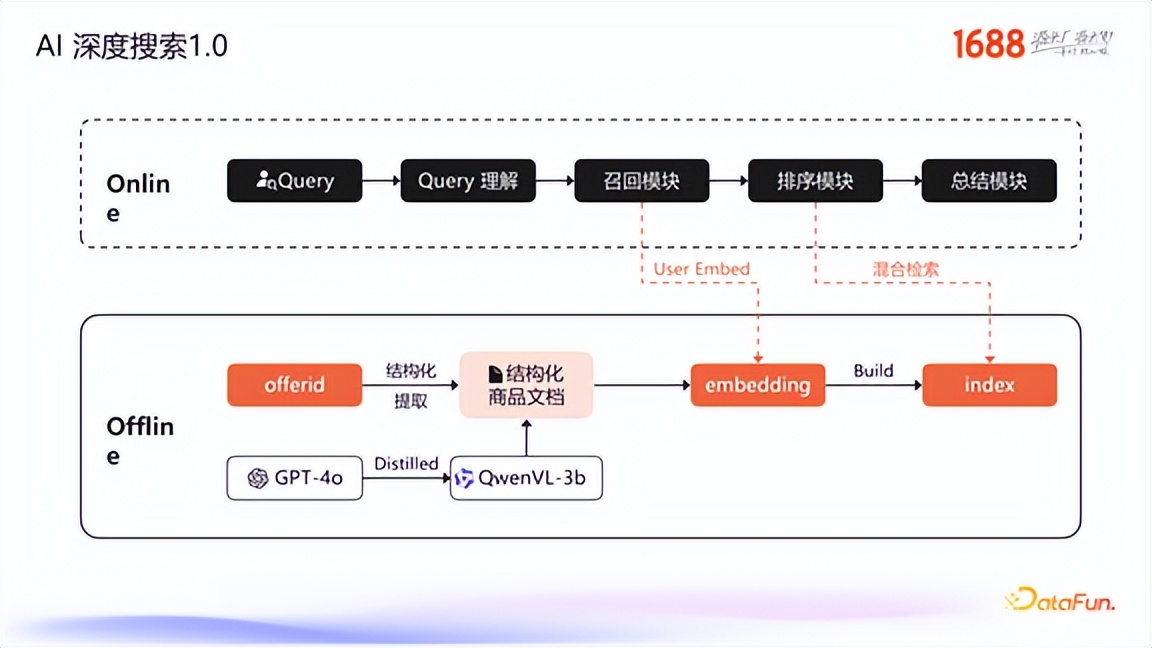 我们首先构建了深度搜索的 1.0 版本,其整体算法框架分为离线和在线两部分。