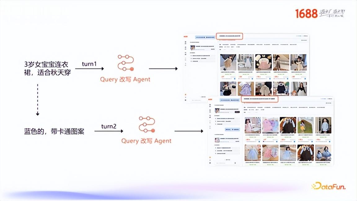 第一轮:用户输入“3岁女宝宝连衣裙,适合秋天穿”。第二轮:用户补充“蓝色的,带卡通图案的”。此时,Query 改写 Agent 会自动将两轮的需求合并,生成一个全新的、完整的 Query:“3 岁女宝宝连衣裙,适合秋天穿,颜色是蓝色,并且带卡通图案的”,然后再次发起检索。2. 快速搜索与深度搜索的动态路由