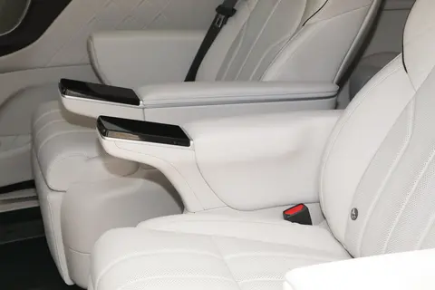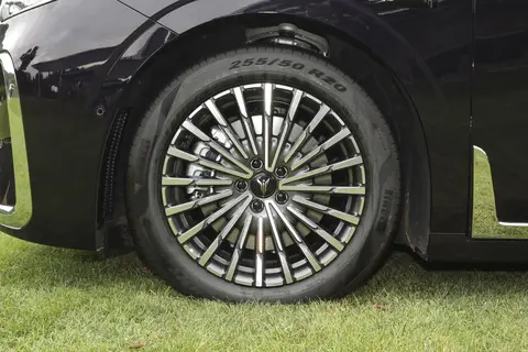 转到车身侧面,平直的车顶设计保证了车内头部空间,搭配悬浮式车顶造型,让车身线条更显时尚。一条贯穿式腰线从车头一直延伸到车尾,不仅让车身看起来更加修长,还为侧面增添了清晰的层次感。隆起的轮眉和侧裙筋线勾勒出明显的肌肉感,再配上大气的多幅式轮毂,让这款车在沉稳之余,又多了几分动感,行驶在城市道路上,既有商务车的端庄,又不失年轻活力。