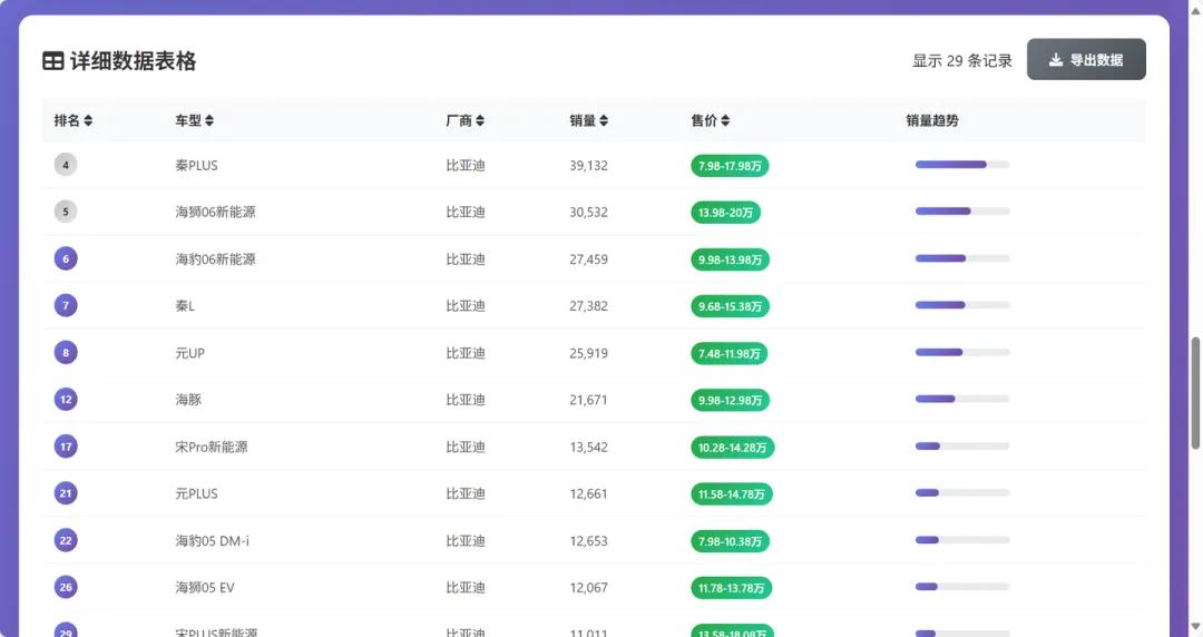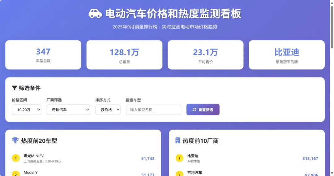 附件是2025年9月电动汽车销量排行榜,里面包含排名、车型、销量、厂商、售价等5个字段,你的任务如下: 1.理解这份数据,若有不清楚的可以和我确认 2.根据这份数据开发一个现代化web看板,应用场景是电动车价格和热度监测。 3、使用前端html+js+css作为技术栈, 4、看板功能如下 4.1 展示目前热度(销量)前20的车型 4.2 展示目前热度(销量)前10的厂商 4.3 能根据价格区间、厂商、热度(销量)字段选择车型 你需要注意以下几点: 1、UI现代化、布局合理、清晰美观 2、交互友好,方便用户查询、点击 3、你要保证代码是可执行的M2照例先出todo清单,列出开发web应用的流程和事项。