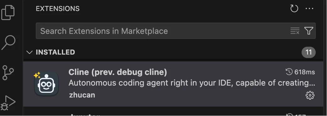 首先咱们需要在VsCode中安装Cline插件,它是安装即用的。