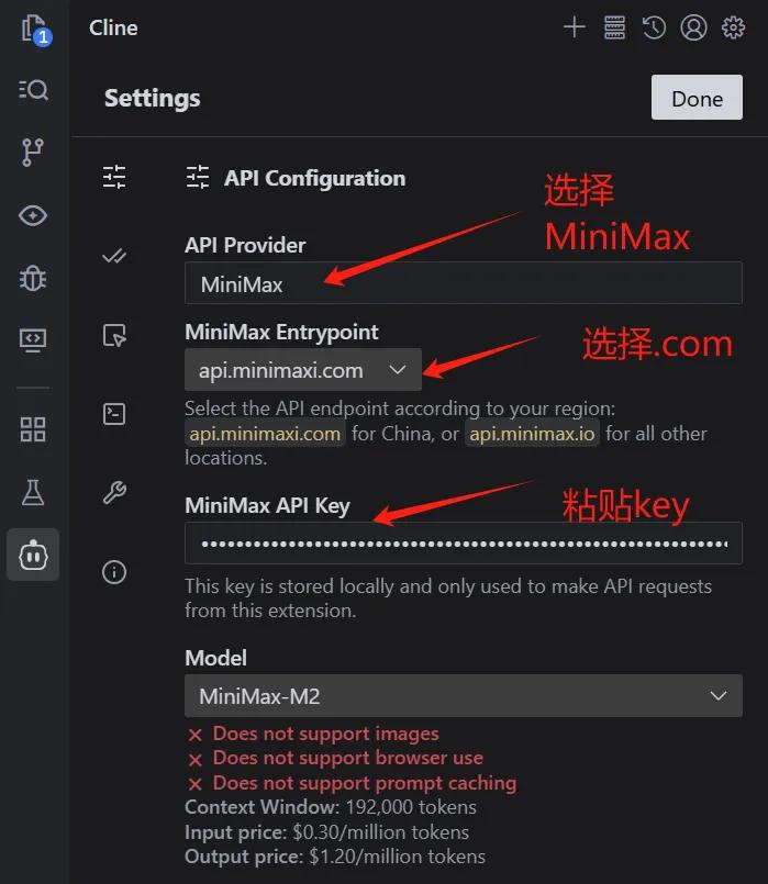 接下来要配置大模型参数,这次是用的MiniMax M2,你需要先申请MiniMax API key,然后配置到Cline中,按照下图操作就能搞定。