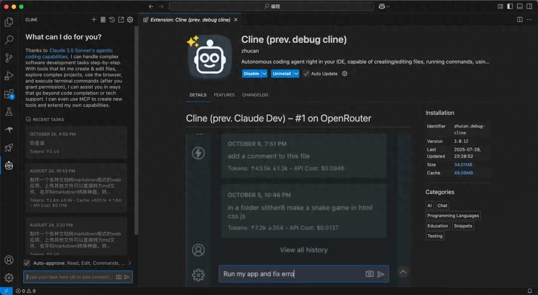 Cline是一款VsCode上的AI编程插件,功能类似于Cursor、Claude Code,能支持连接DeepSeek、ChatGPT、Gemini等各类大模型,还可以部署MCP服务,算是功能齐全、最受欢迎的AI编程工具之一。