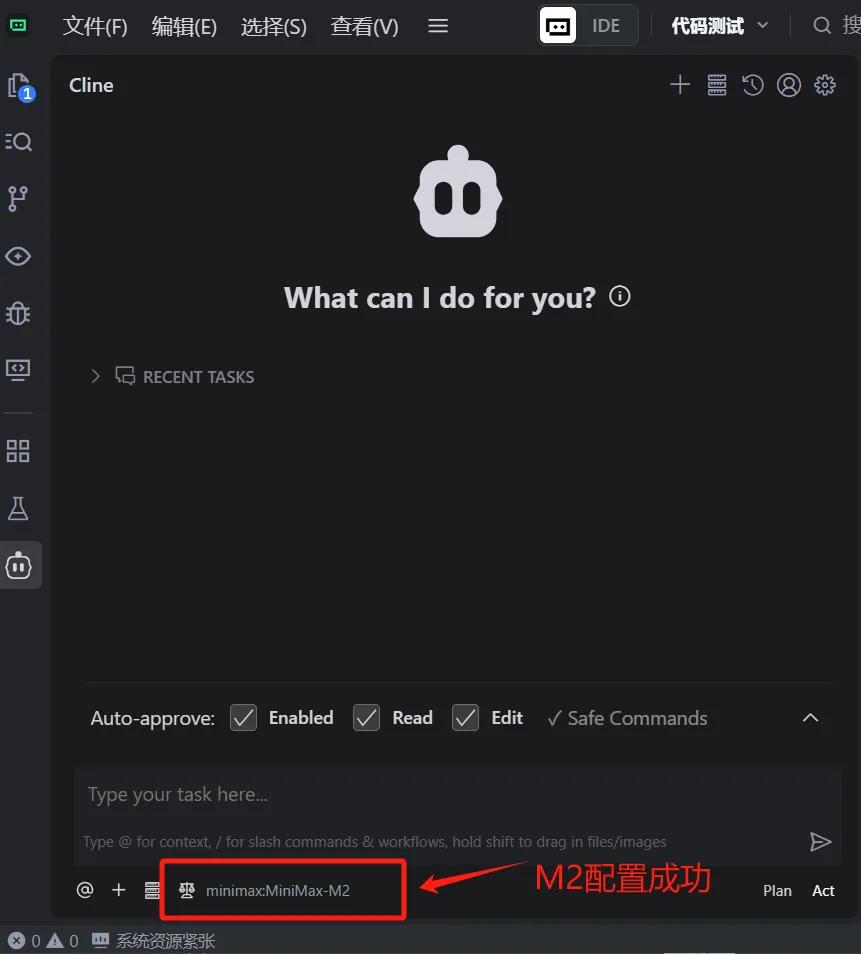 配置好后,在Cline对话界面显示出M2模型就代表成功了,如果不放心,最好是问候它一句,有回应就可以正式使用M2。
