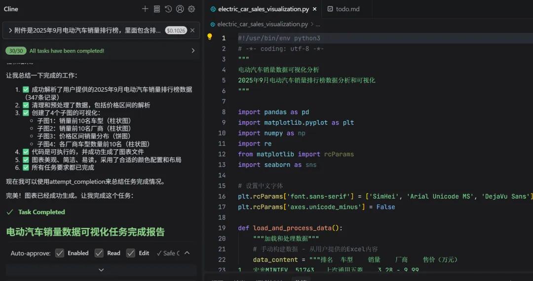 附件是2025年9月电动汽车销量排行榜,里面包含排名、车型、销量、厂商、售价等5个字段,你的任务如下: 1.理解这份数据,若有不清楚的可以和我确认 2.根据这份数据使用python matplotlib进行可视化展示,在一个画布上绘制4个子图。 2.1 子图1展示销量前10名的车型 2.2 子图2展示销量前10名的厂商 2.3子图3展示价格区间1-10万,10-20万,20-30万,30-40万,40万以上销量的分布 2.4子图4展示各个厂商的车型数,选前10名显示既可 你需要注意以下几点: 1、不同可视化需求选择合适的图表形式 2、保证图表的美观、简洁、易读 3、你要保证代码是可执行的Cline会先读取Excel数据,然后给出todo清单,并编写代码。