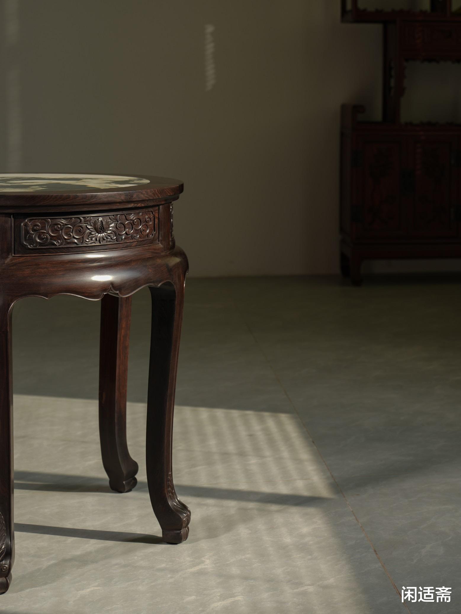 此件镶嵌云石五足圆几,器形源自攻玉山房藏晚明五足圆几,甄选优质紫光檀精制,木色沉穆莹润,肌理致密细腻。同时匠人坚守明式家具“线条即灵魂”的精髓,将材质之美、工艺之巧与古典韵味完美融合,复刻这份罕见的明式雅韵。