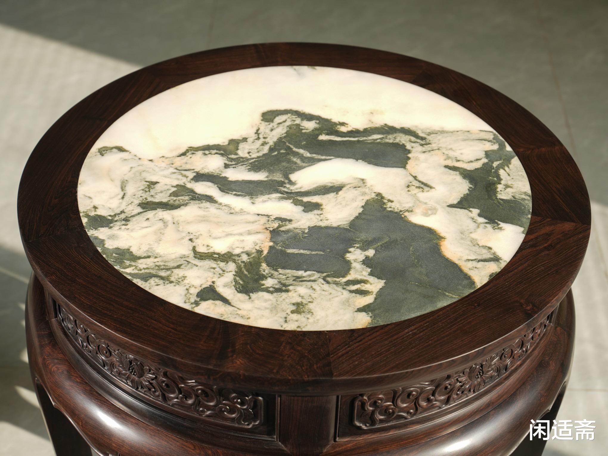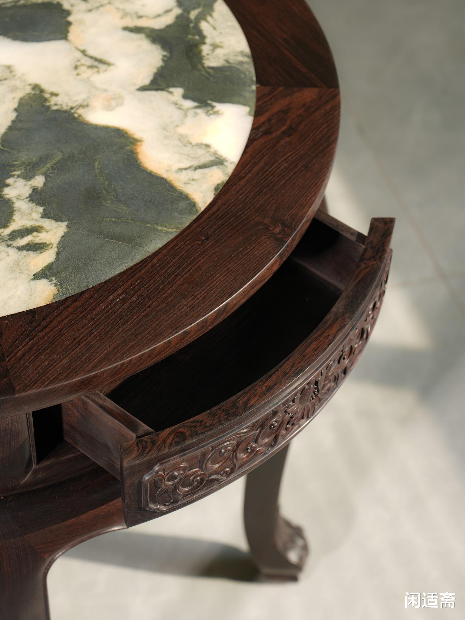 桌面镶嵌纹理清晰生动的大理石面心,天然纹理独一无二,质感温润。与紫光檀的沉穆木色形成巧妙对比,一深一浅、一刚一柔,既凸显材质的珍贵,又增添整体的空灵雅致之感。