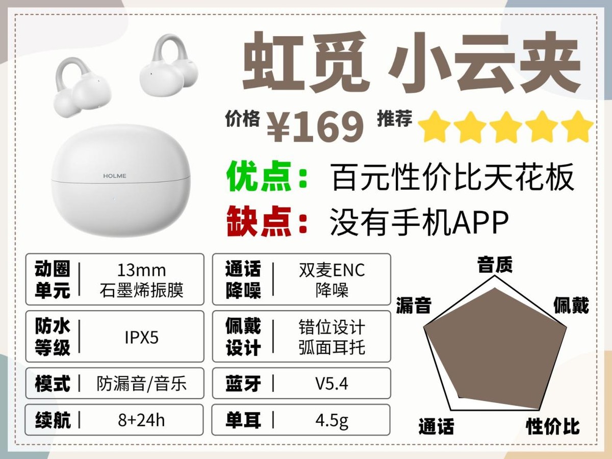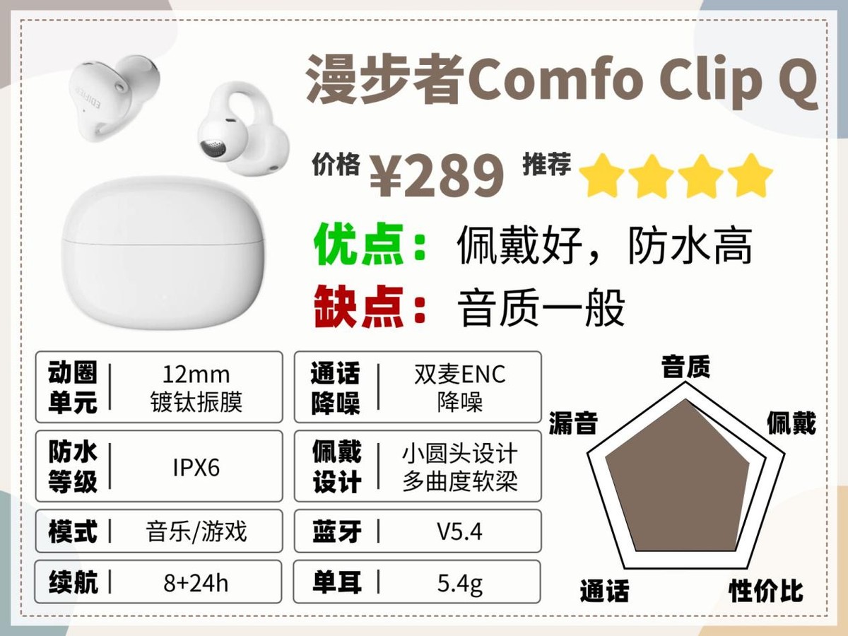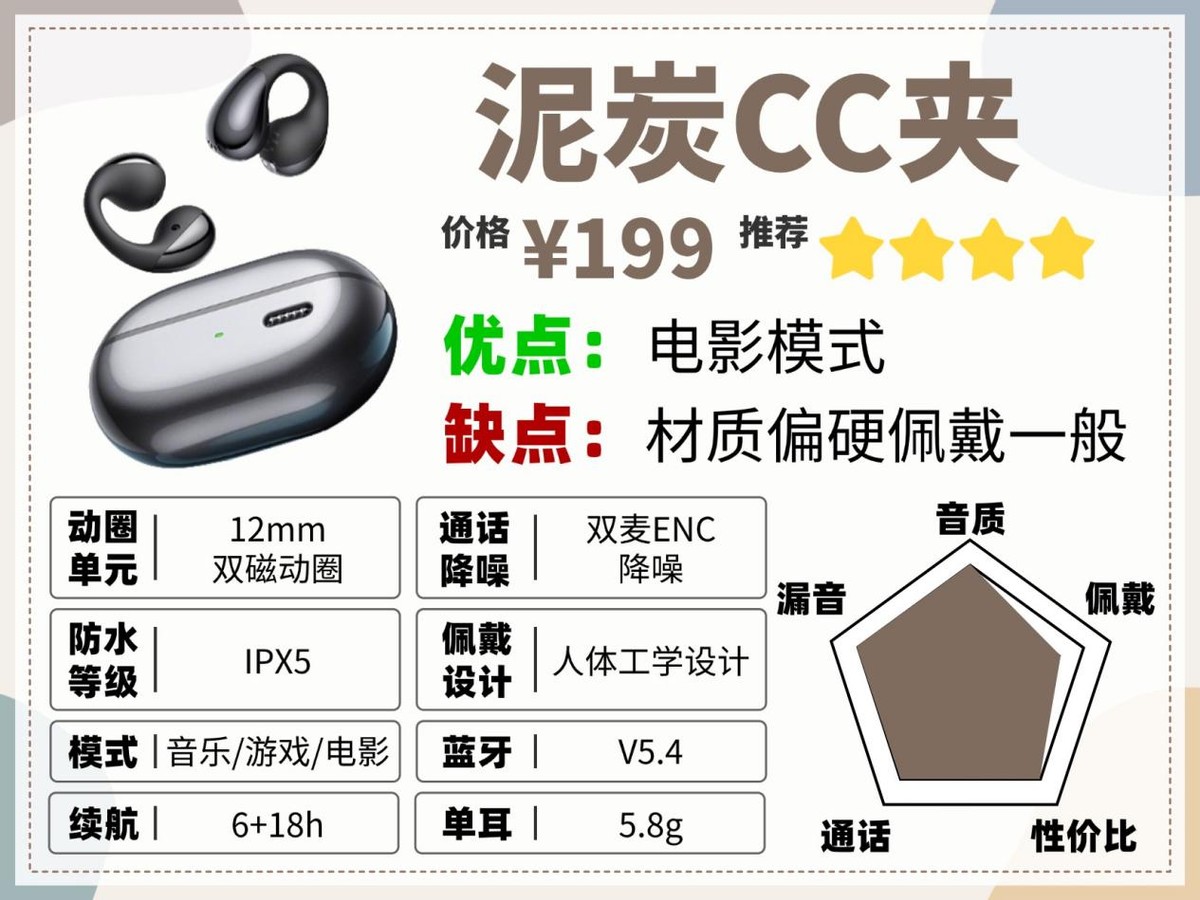推荐理由:不管是功能、音质还是佩戴舒适度方面,都是百元价位最强的耳夹式耳机!