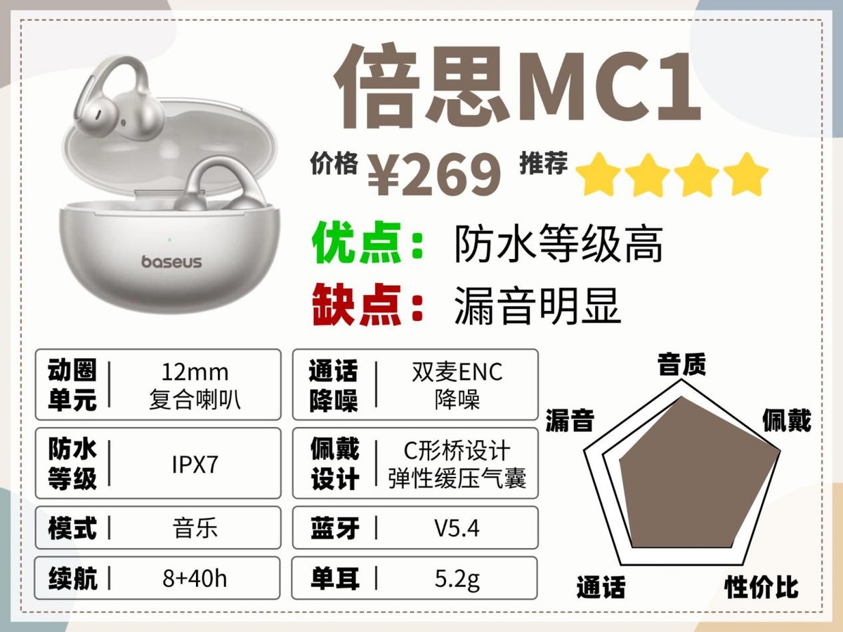 佩戴上,它靠记忆合金和人体工学设计贴合耳廓,日常戴着很稳,不会轻易晃掉。但单耳偏重,长时间戴下来,耳廓会有明显的压迫感,像被轻轻夹着似的,久了会觉得不舒服,舒适性比较一般。音质表现很亮眼,声场开阔且层次分明,低频饱满有力,中高频能听清乐器的细微音色,听感特别好。不过漏音问题挺明显,在公共场所用,得特意调低音量,不然旁边人容易听到声音。双麦降噪效果不错,嘈杂环境打电话,对方也能听清;防水能应对日常出汗溅水,续航也够用。就是不支持一拖二,没法同时连手机和电脑,切换设备时有点麻烦。