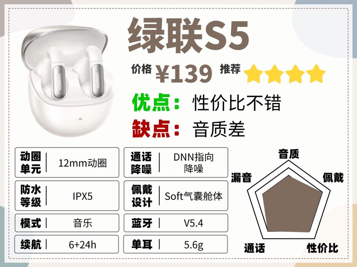 单耳重量5.8g,以高韧性记忆钢丝被包裹在液态硅胶里的复合结构,能够智能适应不同用户的耳廓曲线,提供个性化的稳固佩戴体验。但长时间佩戴后耳廓仍会产生明显夹耳感,舒适性表现较为一般。搭载12mm高性能动量单元,支持360°全景空间音效并采用自研音质增强算法,声场开阔立体,整体音质表现出色。配置上蓝牙是V5.4,还支持一拖二切换设备;IPX5 防水,日常防汗、溅水都没问题;电影、游戏、音乐三种模式很实用。但续航偏短,单次 6 小时、综合 24 小时,得经常充电。