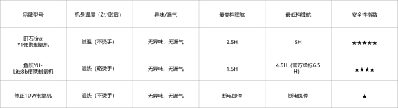测评方法:将3款制氧机连续开机2小时,触摸机身感受温度,观察是否有异味、漏气情况;将便携款(町石、鱼跃)充满电,分别调至最高档和最低档,记录续航时长;测试台式款(修正)的断电后使用情况,评估安全性和续航实用性。