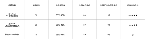 测评方法:将3款制氧机分别调至常用档位(町石、鱼跃调至3L,修正调至1L),开机稳定10分钟后,用血氧仪测量使用前、使用30分钟后的血氧值,同时观察制氧机的浓度显示,连续测试3天,取平均值记录。