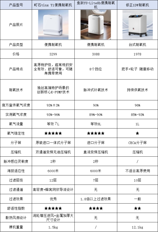 町石tinx Y1、鱼跃YU-Lite8b、修正1DW三款制氧机各有优劣势,鱼跃便携性和操作感不错,但氧浓度不达标、续航虚标;修正价格亲民、操作简单,但为台式机、无续航,便携性差。三款对比实测下来,町石在核心的浓度稳定性、便携性、操作易用性、静音、续航、安全性上,都远超另外两款,高原特护级高端便携制氧机,超常规的安全有效、舒适可靠,可随身携带,完美解决了中老年“怕没用、怕闲置、怕不安全、怕麻烦子女”的顾虑,自己能独立操作,实测表现远超同价位竞品,是中老年日常保健的首选。町石唯一的缺点是价格比普通台式机略高,但长期看性价比更高,耐用扎实,能避免频繁更换机器的麻烦。结合实测和科普知识,核心选购逻辑就是:先看氧浓度是否达标(93%±3%),再看便携性和操作易用性(适配中老年),最后看安全性、续航和静音,掌握这3点,就能避开大部分坑。