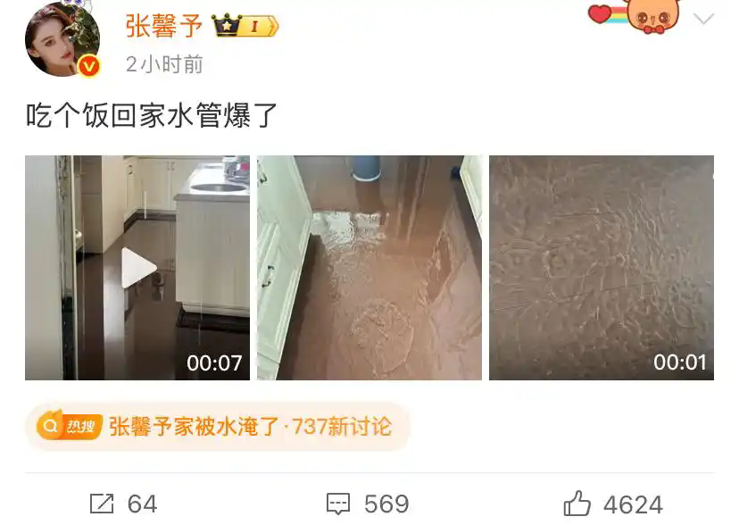 豪宅神话的破灭与共情 事件意外揭露了高端住宅的隐忧——价值千万的房产同样面临管道老化、物业响应滞后等问题。张馨予全程未提及追责,而是自行处理的态度,引发对"隐蔽工程维护盲区"的讨论。网友感叹:"原来明星的水管也会造反,在灾难面前大家都一样。"