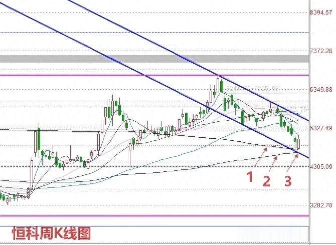 第三,根据我对港股恒生指数的观察,恒生指数目前也跌到了关键的支撑点,并且恒生科技指数,周线级别也出现多重重要支撑集合的情况。大家请看恒生科技指数周K线图。所以如果港股恒生指数,恒生科技指数同步向上走的话。我们也可以从侧面得出A股即将走强的结论。