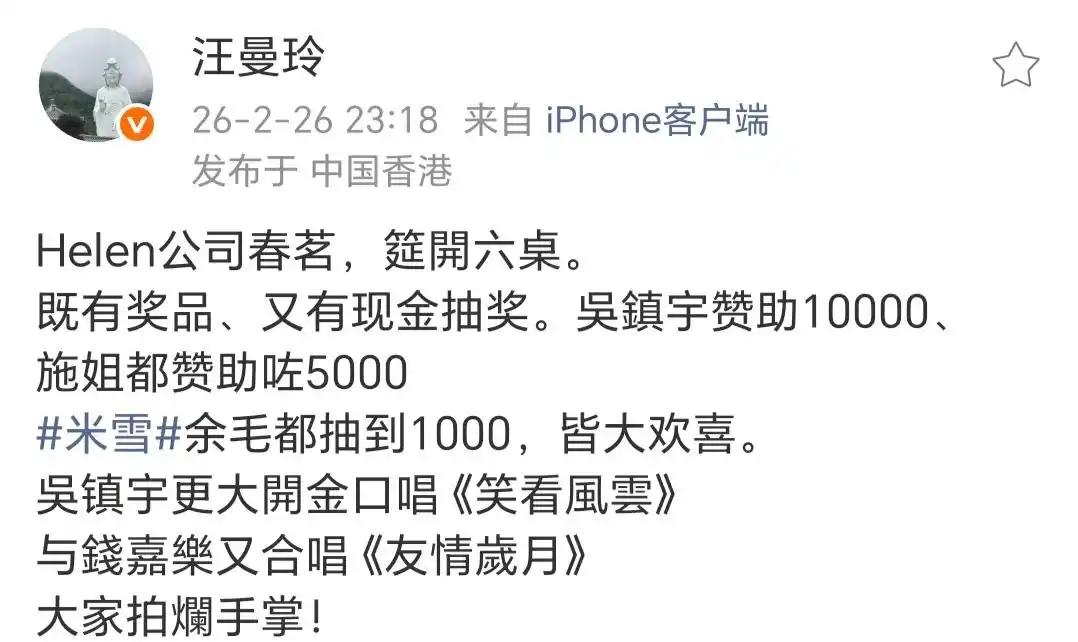 根据资深媒体人汪曼玲所透露的情况,此次Helen公司举办春茗,特意摆宴六桌,筹备工作做得极为用心,现场非但设置了各种各样的奖品,还安排了现金抽奖这一环节,使得来到现场的嘉宾全都能够收获满满地回去。当中,吴镇宇表现得格外大方,主动拿出1万港元来助力抽奖;彭美施也就是施姐同样慷慨地拿出钱来,赞助了5000港元;米雪以及毛姐也就是余慕莲相当幸运,她们各自都抽到了1000港元的现金奖励。吴镇宇更是全然放开,自始至终兴致高昂,还颇为罕见地大力秀出歌喉,给现场嘉宾呈上了独唱表演,一曲《笑看风云》唱得深情款款、婉转悠扬且韵味十足,眨眼间点燃了现场氛围;进而,他又与钱嘉乐并排合唱经典曲目《友情岁月》,两人配合得极为默契、歌声动听迷人,台下掌声此起彼伏、欢呼声接连不断,把整场春茗那热闹的氛围推至高潮。
