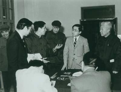 钱保功(右一)、黄葆同(左四)等向来访专家介绍辐射化学研究情况(图片来源:中国科学院院士文库)