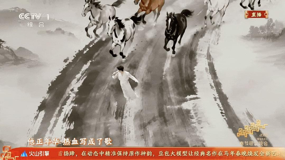 在最近火爆全球的视频生成模型Seedance 2.0赋能下,徐悲鸿的《六骏图》被数字化,更被赋予了生命力。动态水墨完美还原了骏马昂首扬蹄的神韵与奔腾气势,搭配流动的山河水墨长卷,营造出人在画中游的沉浸感,精准戳中了马年生肖主题。