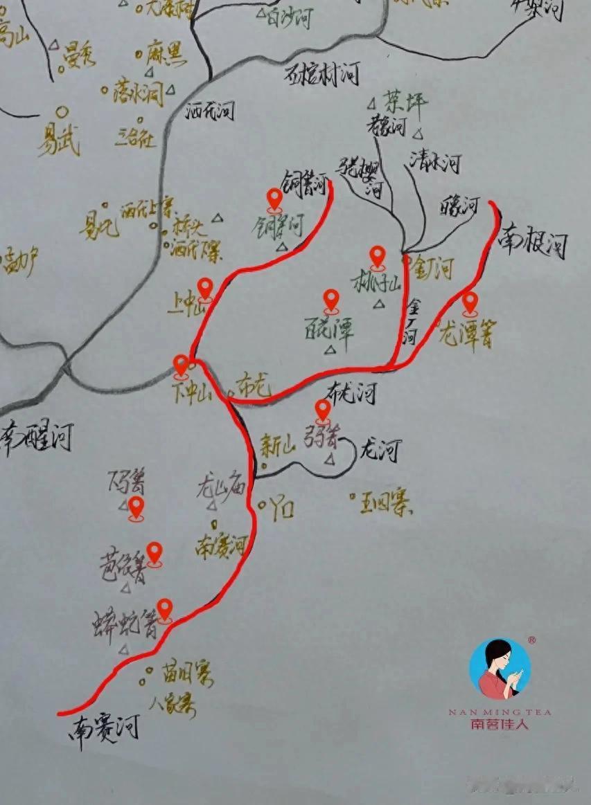 瑶区这边的山头基本沿着河流分布,我们就从河流的方向展开说。在易武瑶区最主要的一条河流就是布龙河,在布龙河源头有金厂河和南根河两条河流汇集。
