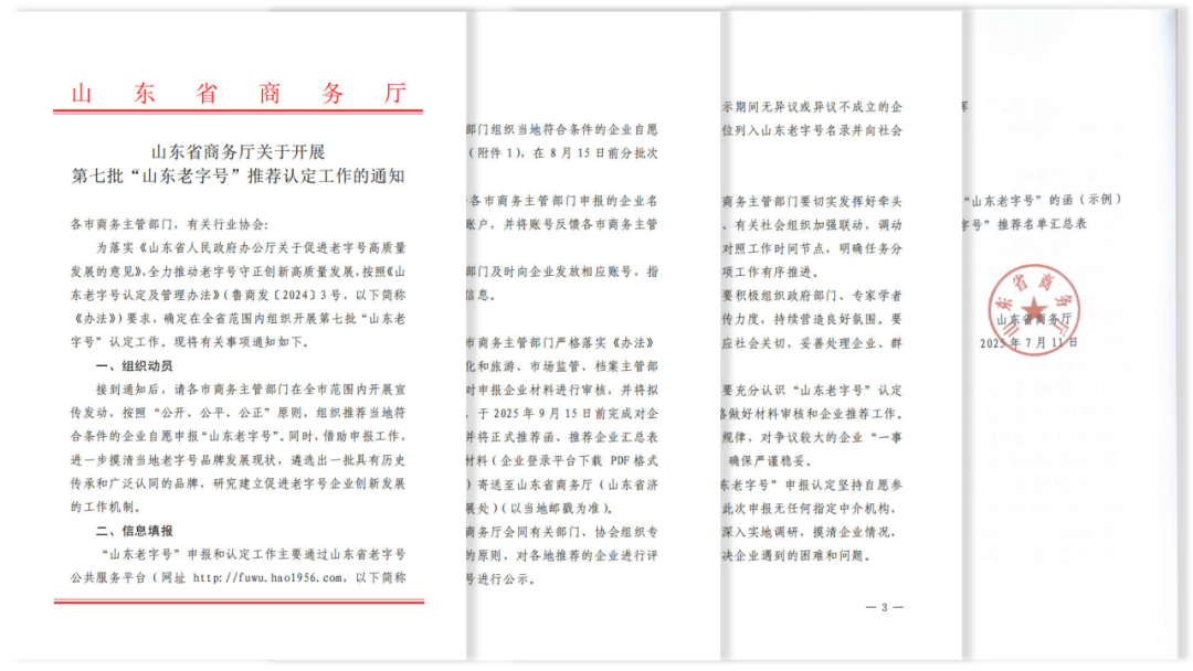 7月,山东省商务厅印发《关于开展第七批“山东老字号”推荐认定工作的通知》,组织各市宣传发动、推荐申报,并借此进一步摸清当地老字号企业发展现状,遴选出一批具有历史传承和广泛认同的品牌。目前,认定工作已进入实地调研阶段。
