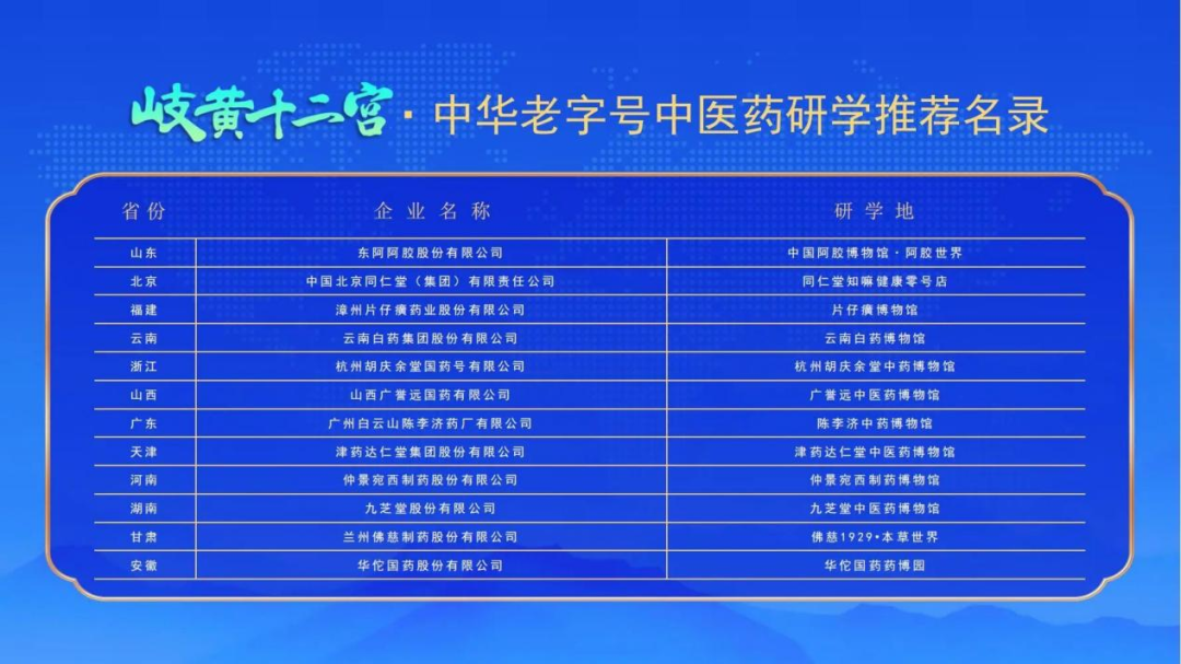 通过全国范围遴选,发布“岐黄十二宫·中华老字号中医药研学推荐名录”,东阿阿胶等全国12家中医药老字号首批入选,通过打造行业标杆性研学体系,助力中医药文化国际化传播,全面激发中医药老字号的创新活力与发展动能。