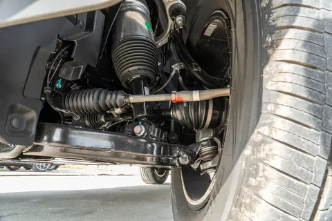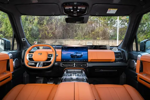底盘和操控方面,该车采用非承载式车身结构,配备前置四驱系统和电动四驱类型,前悬挂为双叉臂式独立悬挂,后悬挂同样为双叉臂式独立悬挂,同时配备了空气悬挂,支持软硬 + 高低调节,能够根据不同路况和驾驶模式调整悬挂状态,兼顾了舒适性和越野性能。该车的最小离地间隙为 230mm,接近角 40.0°,离去角 32.0°,最大爬坡度达到 100.0%,同时具备低速四驱、坦克掉头、蠕行模式等越野配置,能够轻松应对沙、草、湖、山、林、戈、滩等多种复杂地形。在驾驶模式方面,该车提供运动、越野、雪地、ECO / 经济、标准舒适等多种驾驶模式选择,满足不同场景下的驾驶需求。