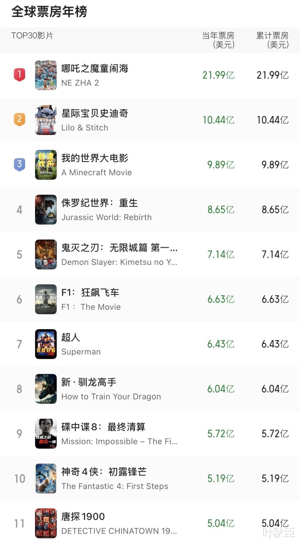 它的前方,除了刚刚提过的国产片《哪吒2》(21.99亿美元)和《唐探1900》(5.04亿美元)之外,还剩下《神奇4侠:初露锋芒》(5.19亿美元)《碟中谍8:最终清算》(5.72亿美元)《新·驯龙高手》(6.04亿美元)《超人》(6.43亿美元)《F1:狂飙飞车》(6.63亿美元)《鬼灭之刃:无限城篇》(7.14亿美元,在映中)《侏罗纪世界:重生》(8.65亿美元)《我的世界大电影》(9.89亿美元)和《国际宝贝史迪奇》(10.44亿美元)。