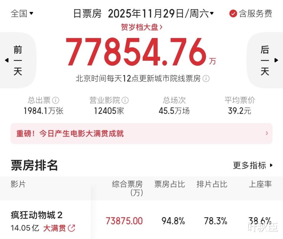 刚刚过去的周六,该片的票房占比已经达到惊人的94%以上,排片更是高达78.3%,同档期内几乎没有任何对手可言。