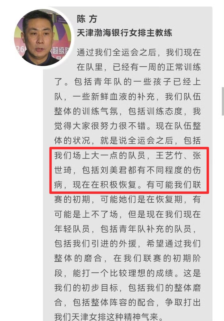 另外一个就是天津女排的伤病问题,主教练陈方在接受采访的时候表示,王艺竹、张世琦和刘美君在联赛初期要养伤,所以大概率不会登场,因此作为队长的杨艺将会成为球队真正的老将,压力还是非常大,基本上新人主打的天津女排也迎来了最彻底的新老交替。其实王艺竹和刘美君有伤可以理解,但是基本上没有怎么打比赛的张世琦也有伤的话,的确让人比较难理解,这也从侧面反映了天津女排的训练量还是非常大,所以大训练量导致受伤也就不足为奇。
