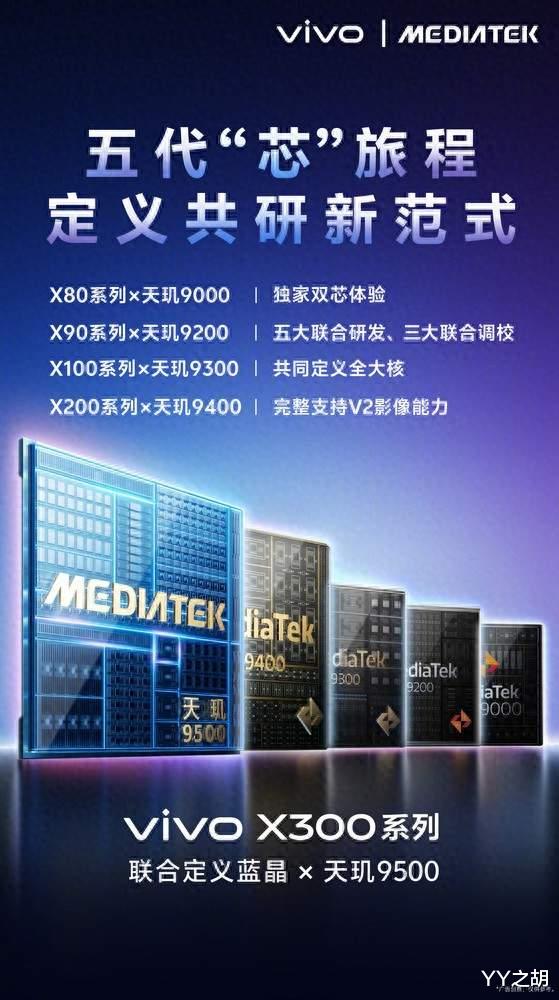 在核心配置上,和之前互联网上的爆料信息一致,vivo X300系列全球首发联发科天玑9500平台。按照介绍,这颗芯片采用台积电N3P工艺制造,相较于天玑9400和9400+所使用的N3E工艺,能效比和性能进一步提升。在此基础上,联发科天玑9500平台的安兔兔跑分突破400万分,是安卓阵营第一款跑分突破400万大关的旗舰芯片。