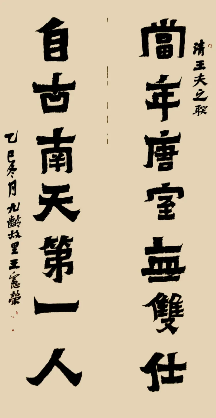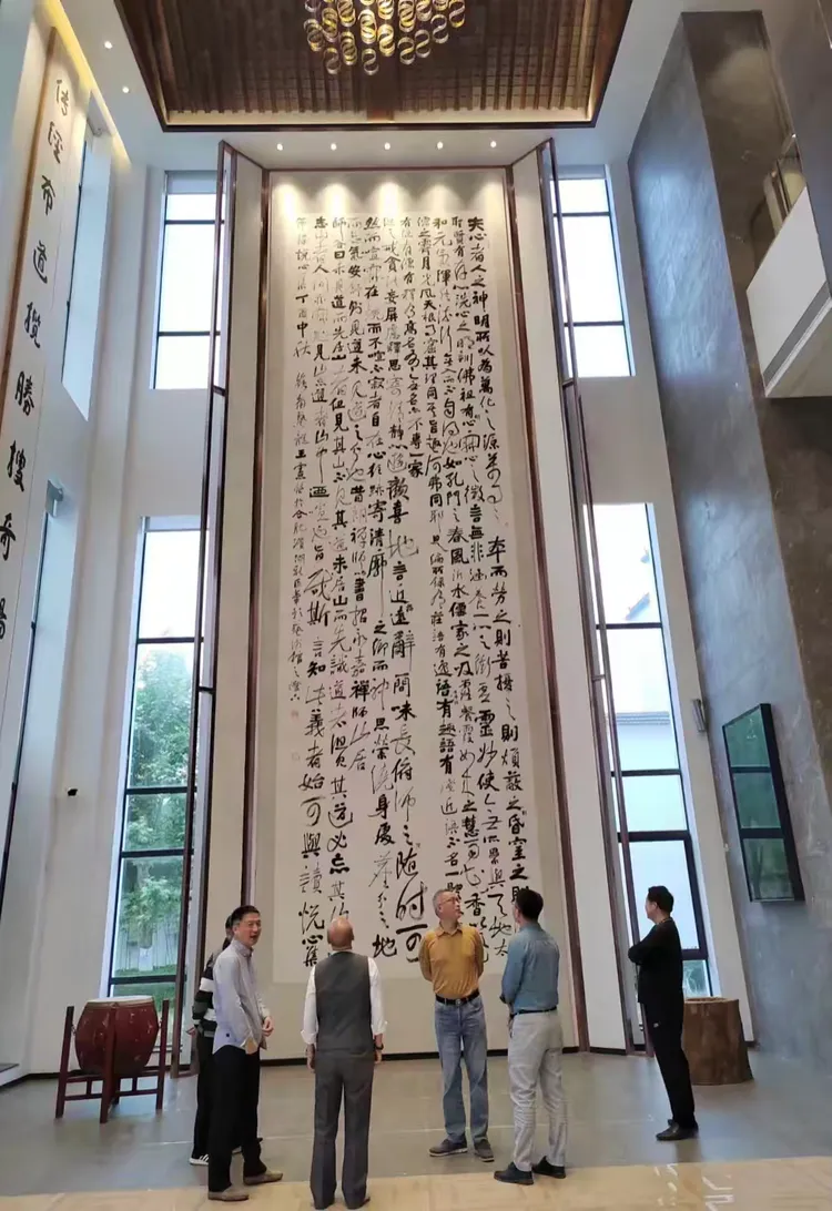 步入展厅,王宪荣先生这幅巨幅书法作品如同一座精神丰碑,瞬间攫住所有目光。数米高的尺幅之上,笔墨纵横驰骋,碑帖相融的笔意贯穿始终:魏碑的雄强骨力与行草的灵动洒脱浑然一体,起笔如凿石开山,顿挫间见金石气韵;行笔如江河奔涌,连绵中见磅礴气势;收笔如苍松坠石,沉稳中见万千气象。